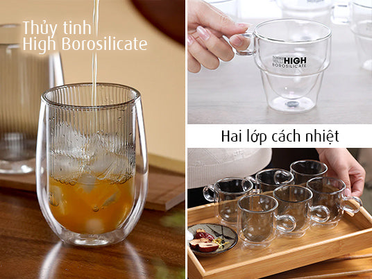 Thủy tinh High Borosilicate, chịu nhiệt từ -30°C đến 150°C, chống sốc nhiệt tốt. Không chứa chì, không ám mùi.