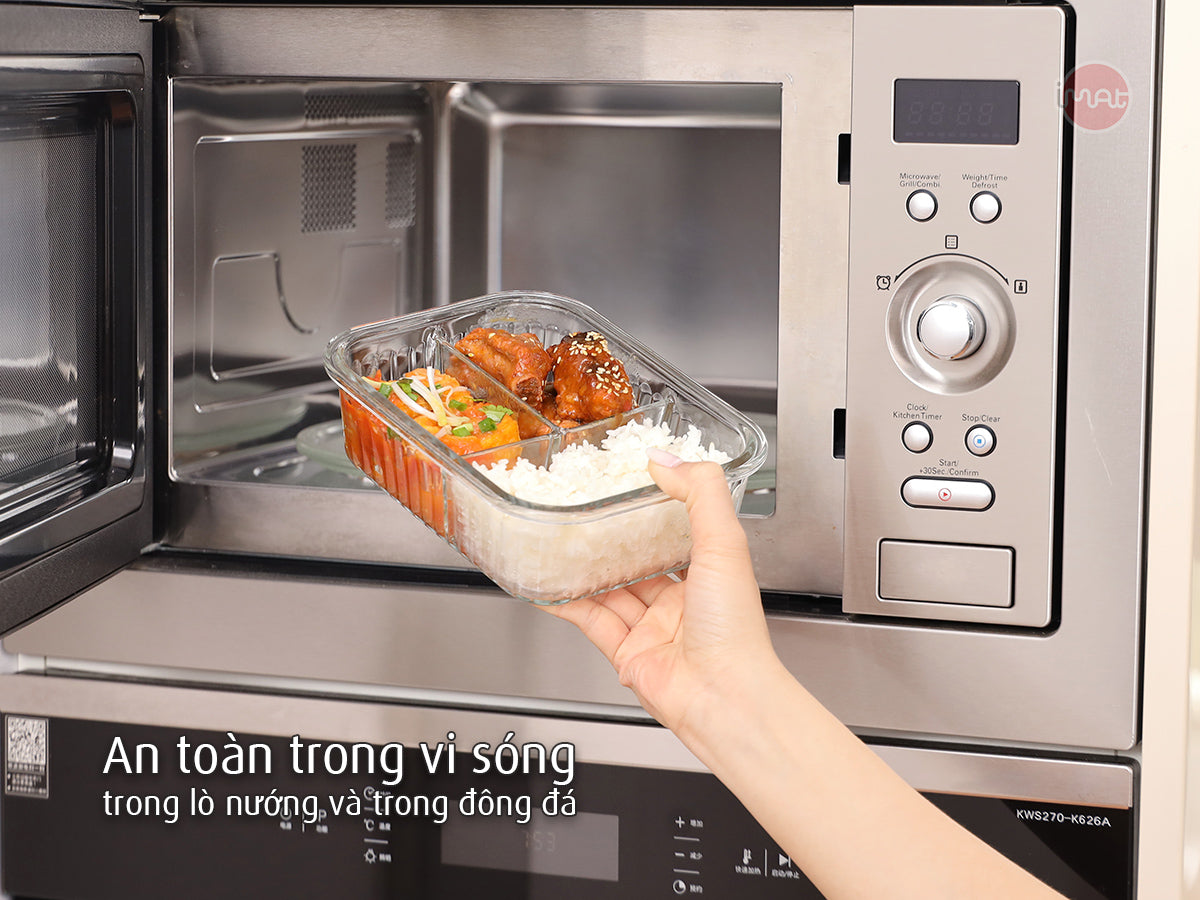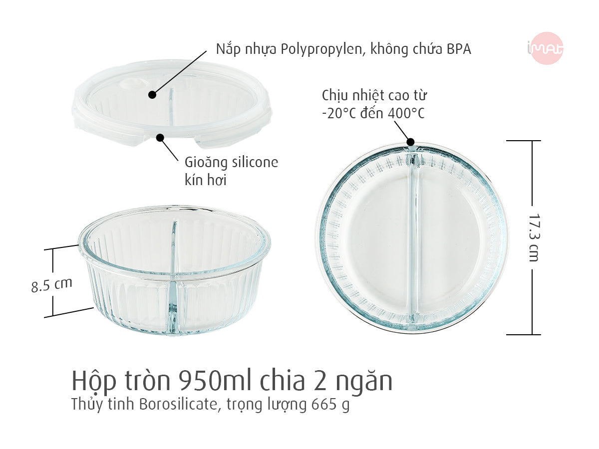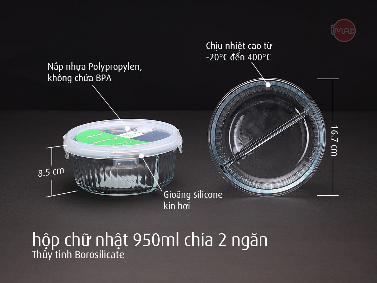 - 2 hộp tròn 950ml chia 2 ngăn.