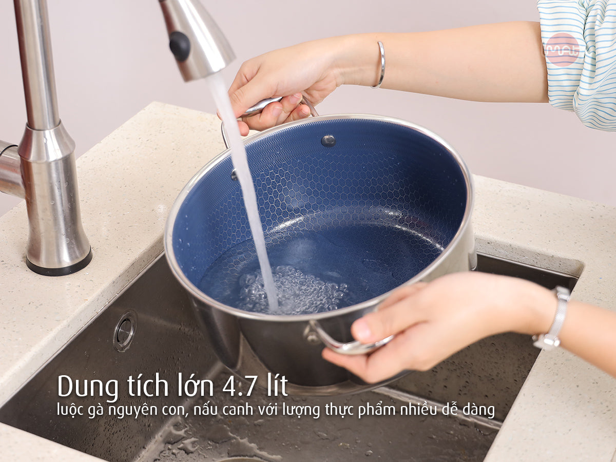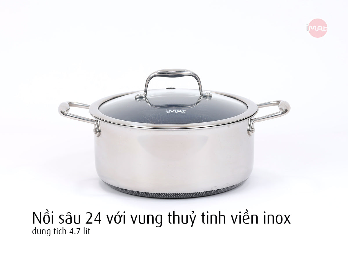 - Nồi sâu 24cm: Dung tích lớn 4.7 lít, lý tưởng cho các món luộc như gà nguyên con (dưới 3kg cả lông), cá lớn, hoặc nấu canh với lượng thực phẩm nhiều.