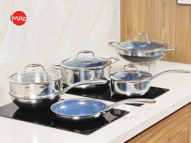 Bộ 5 nồi chảo iMat Hybrid gồm 10 món, thiết kế với công nghệ hiện đại, kết hợp giữa inox và lớp chống dính gốm xanh an toàn, không chứa PFOA hay PFAS. Đây là lựa chọn lý tưởng cho gia đình từ 4-10 người, đáp ứng mọi nhu cầu nấu nướng từ bữa ăn nhỏ đến lớn.