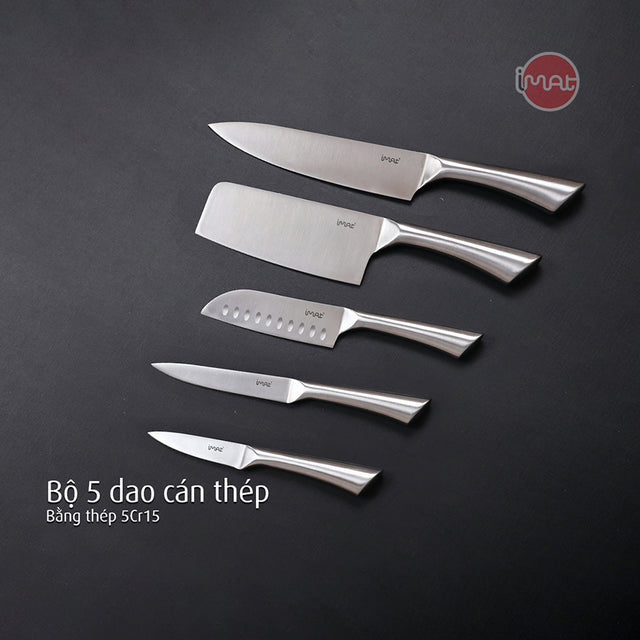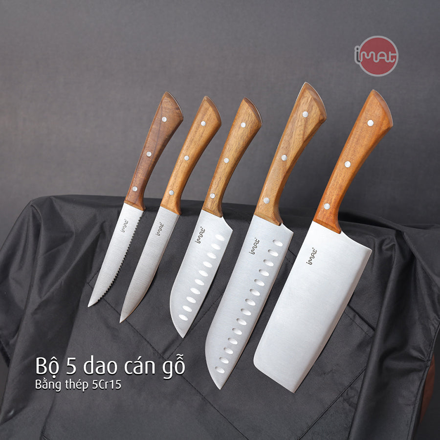 Bộ dao nhà bếp iMat đáp ứng đầy đủ nhu cầu chế biến thực phẩm với thiết kế bền bỉ và lưỡi thép 5CR15 sắc bén, giúp dễ dàng băm, thái mọi nguyên liệu. Bộ dao bao gồm 4 hoặc 5 con với tùy chọn cán gỗ hoặc cán thép, thiết kế tay cầm chắc chắn và độ hoàn thiện cao, là dụng cụ thiết thực cho mọi gia đình.