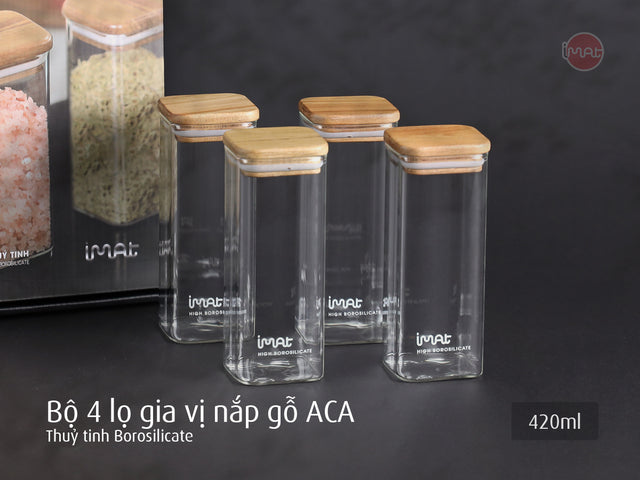 Bộ 4 lọ gia vị thuỷ tinh borosilicate ACA 420ml, nắp gỗ