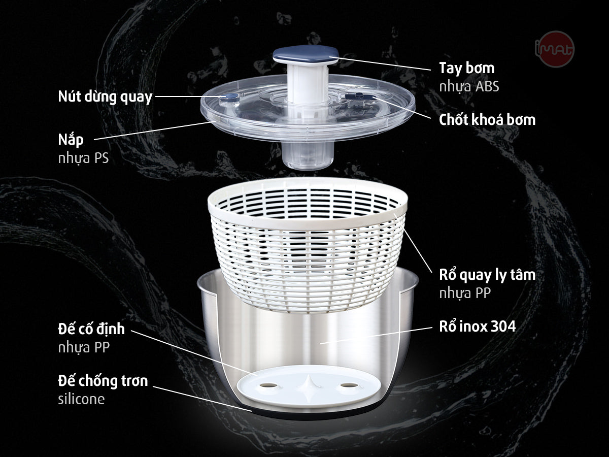 Với rổ quay rau iMat, mọi thứ đơn giản hơn nhiều: chỉ cần bơm – và bơm, bạn sẽ có ngay phần rau ráo nước tới 72% mà không cần dùng lực. Cơ chế bơm lực quay ly tâm tạo tốc độ lên đến 500 vòng/phút khi có rau (và tới 700 vòng/phút khi không tải), giúp đẩy nước ra khỏi bề mặt lá rau nhanh chóng, nhẹ nhàng mà vẫn giữ nguyên độ giòn và tươi của rau.