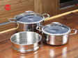 Dùng hàng ngày: Nồi 20 cm và nồi sâu 24 cm, phù hợp gia đình 2–6 người. Tặng xửng 20 cm: hấp thực phẩm tiện lợi, chồng lên nồi 20 cm.