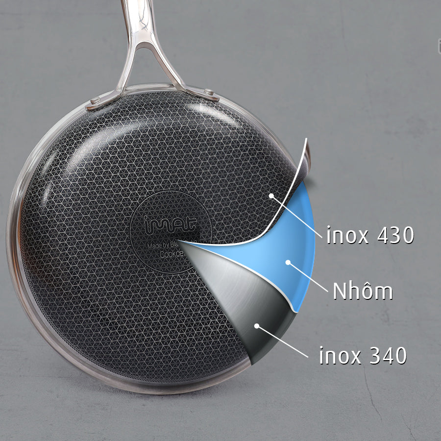 Cấu trúc 3 lớp Triply: Lớp inox 304 tiếp xúc trực tiếp với thực phẩm, lớp nhôm ở giữa giúp truyền và giữ nhiệt tốt, và inox 430 bên ngoài cho phép sử dụng trên bếp từ.