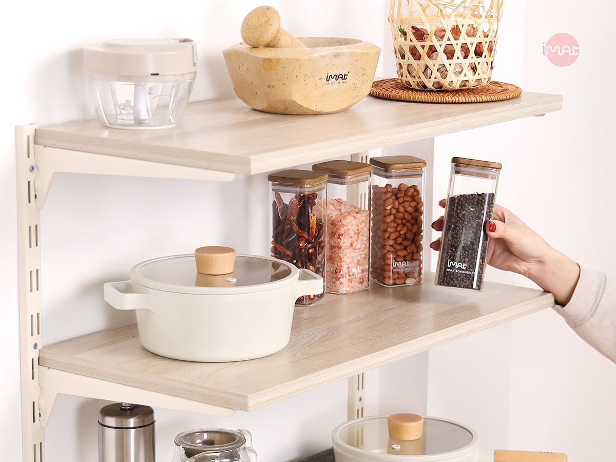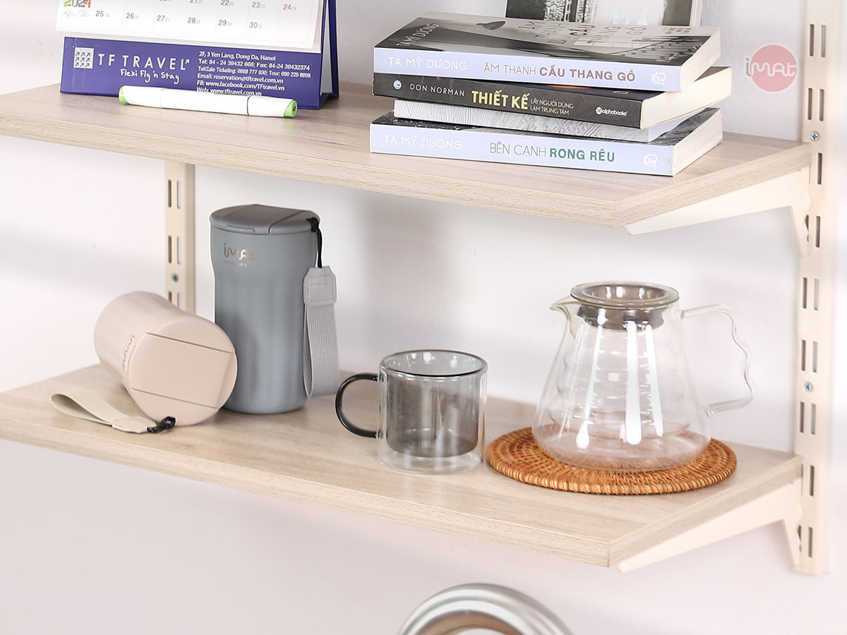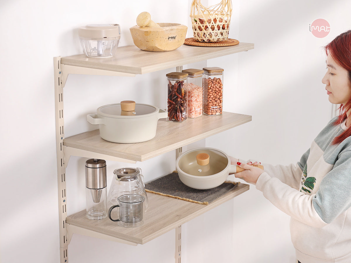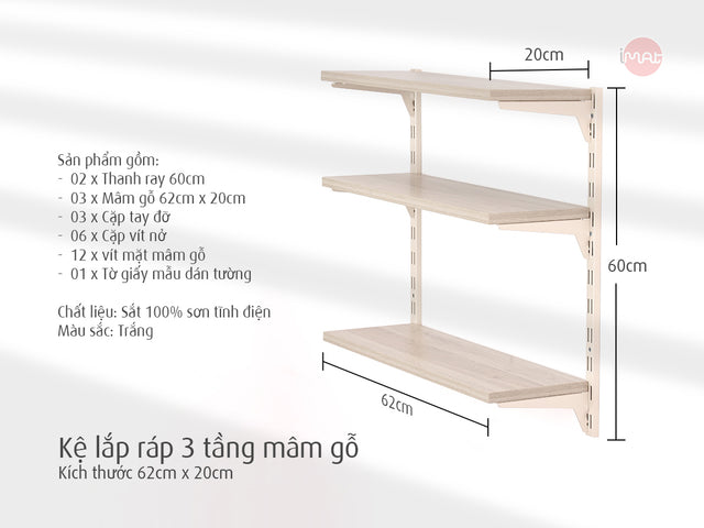 Tự lắp đặt kệ gắn tường DIY iMat. Chất liệu thép sơn tĩnh điện màu trắng sáng. Kệ 3 tầng bằng gỗ, độ rộng mâm gỗ 60 x20cm hoặc 60 x 30cm, dùng cất trữ sản phẩm cho bếp, phòng khách hoặc không gian trang trí khác.