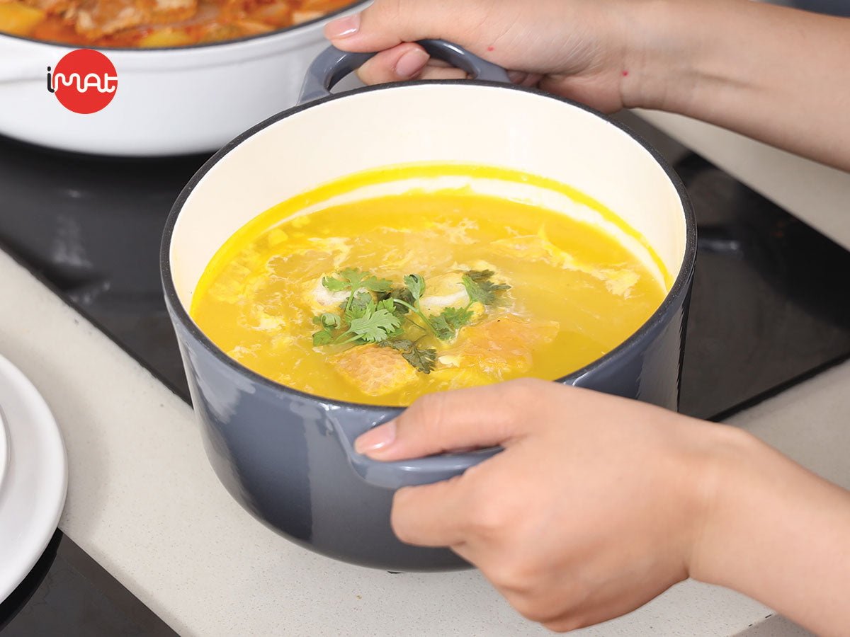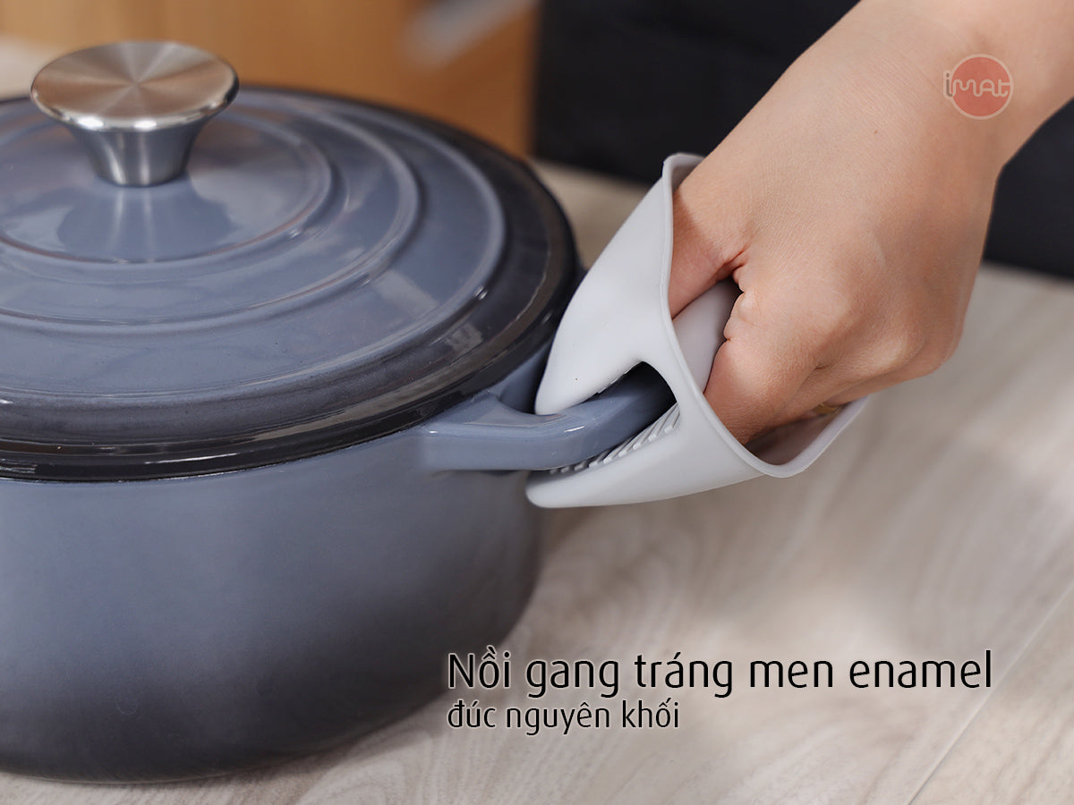 Nồi gang tráng men enamel được đúc nguyên khối, phủ men enamel cao cấp, vừa giữ nhiệt hoàn hảo, vừa an toàn cho sức khỏe.