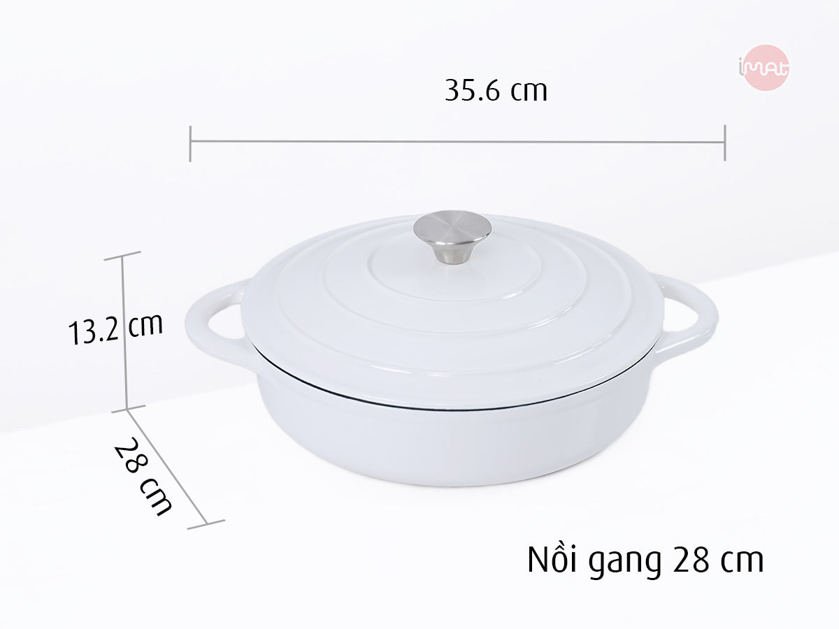 Nồi gang tráng men 28cm được thiết kế với thành thấp đặc trưng, dung tích rộng rãi, rất phù hợp cho những món ăn cần không gian nấu thoáng và dễ đảo trộn.