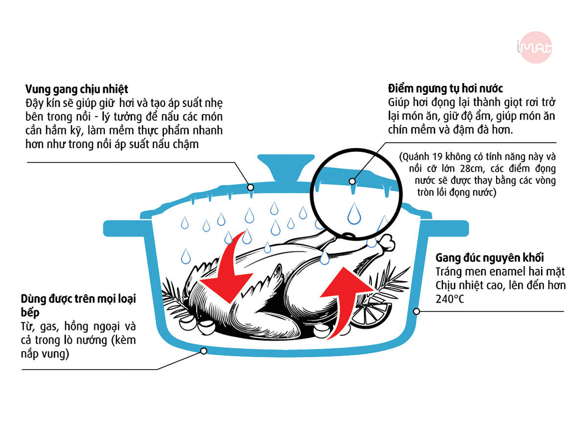 Thành và đáy nồi dày: Giữ nhiệt lâu, lan tỏa đều, giúp món ăn chín kỹ nhưng không khô. Vung đúc kín khít, có các vòng tròn giúp đọng nước rơi trở lại món ăn khi nấu giúp món ăn mềm mại và đậm đà hơn.