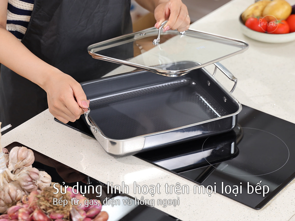 Sử dụng linh hoạt trên mọi loại bếp: Chảo vuông iMat Hybrid có thể sử dụng trên bếp từ, bếp gas, bếp điện và bếp hồng ngoại, mang lại sự tiện lợi cho mọi loại gian bếp.