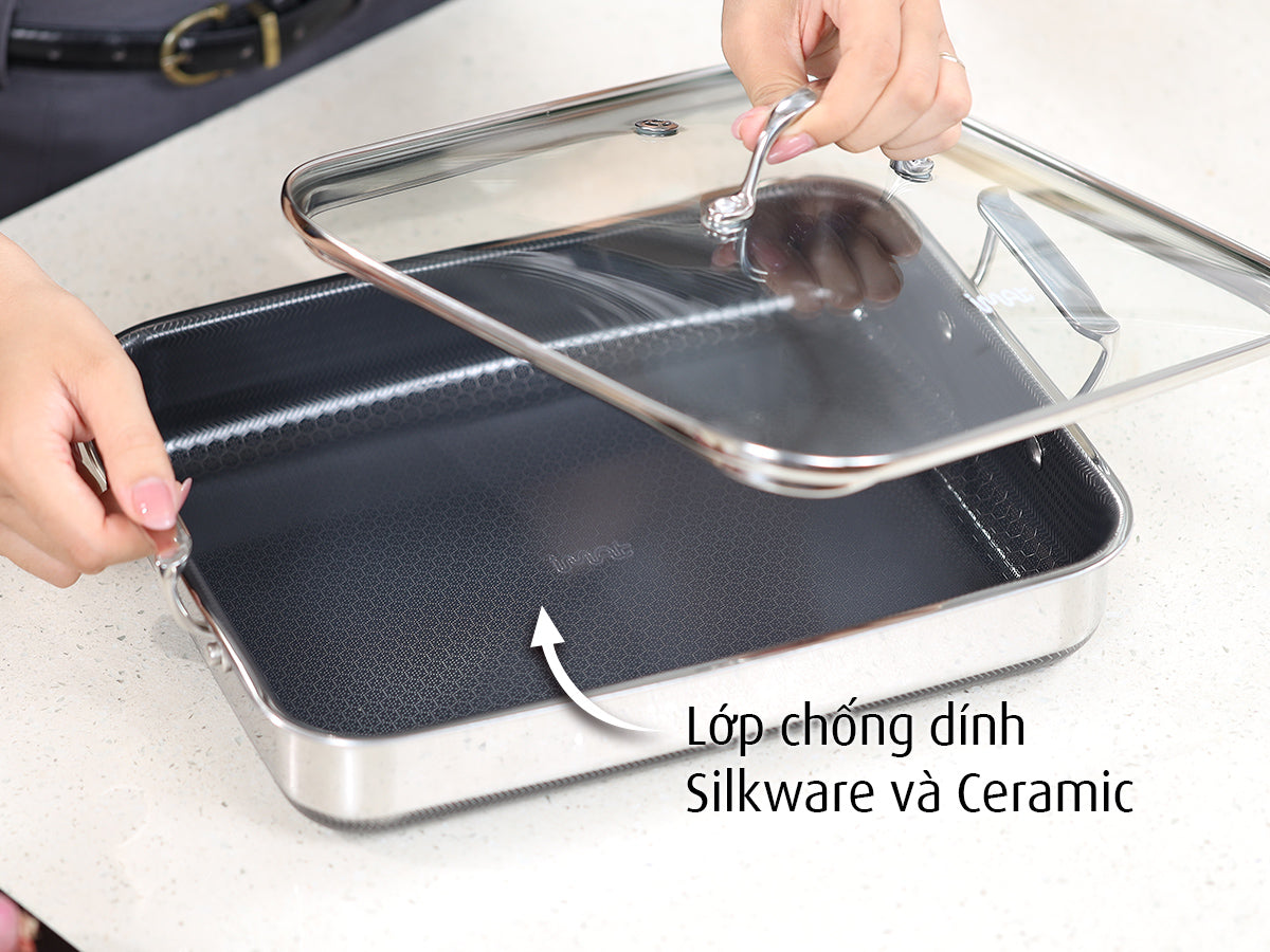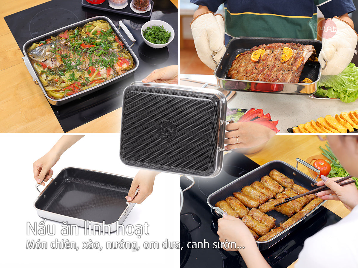 - Thiết kế vuông đa năng: Với diện tích rộng, chảo vuông giúp chế biến các món ăn dài, rộng và xếp chặt thực phẩm, tối ưu không gian nấu nướng so với chảo tròn thông thường.