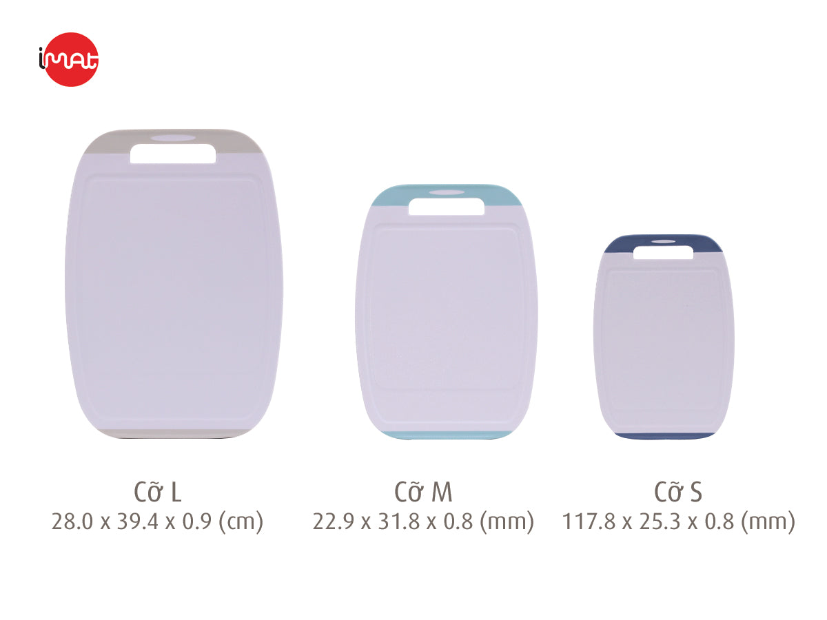 Thớt nhựa PP đặc có chứa hoạt chất Microban kháng khuẩn. Có 2 mặt sử dụng đầy đủ các tác vụ trong bếp từ thái, cuộn thực phẩm hay chặt gà, vịt được (nên lót tấm khăn mềm dưới đáy thớt) đủ cỡ: Hình chữ nhật cỡ lớn với kích thước 28x 39cm, cỡ vừa 22,9 x 31.8cm hoặc cỡ nhỏ 17.8 x 25.3cm.