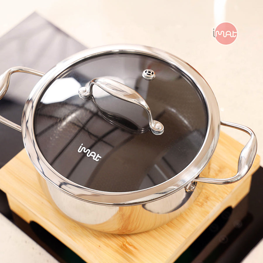 Vung nồi bằng thuỷ tinh chịu nhiệt, trong suốt nên dễ quan sát thực phẩm trong khi nấu. Logo iMat in sắc nét trên vung và đáy nồi.