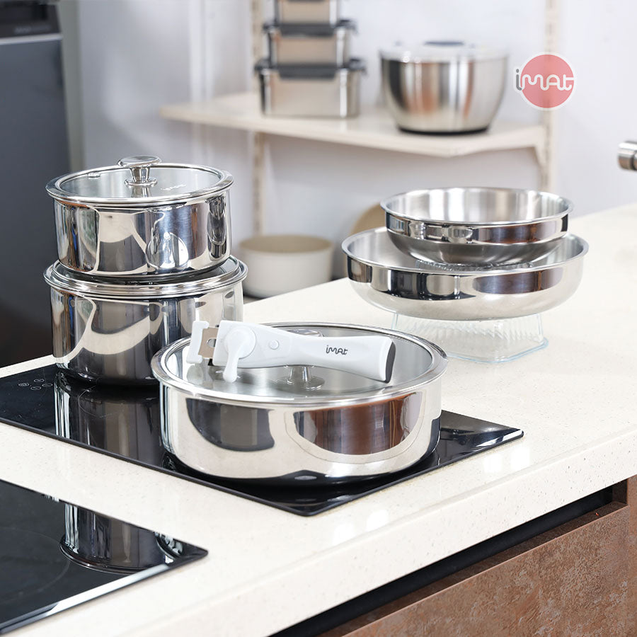 Thiết kế thông minh: Bộ nồi chảo cán rời dễ lưu trữ, tiết kiệm diện tích bếp.
