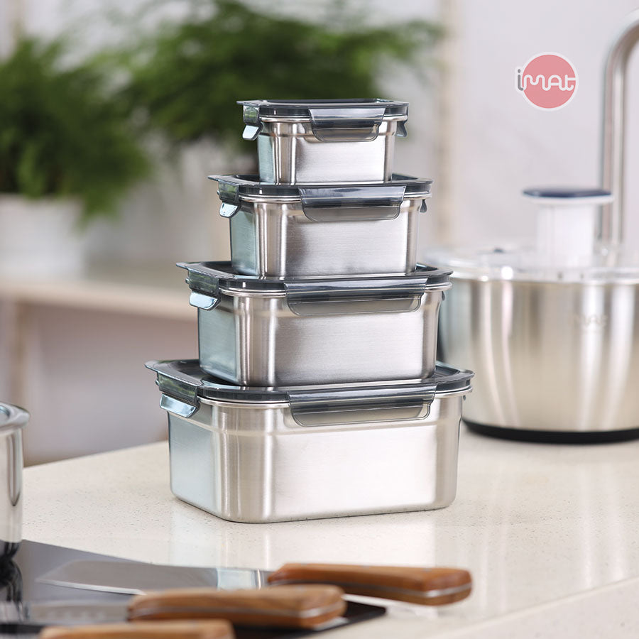 Bộ 4 hộp inox dùng vi sóng | 320ml / 800ml / 1600ml / 3200ml | Tổng: 1185g | Nắp khóa 4 cạnh, bảo quản & hâm nóng (không dùng nắp trong vi sóng) |