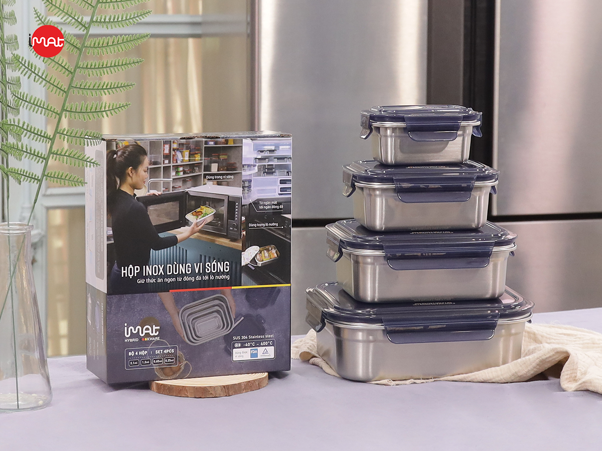 Bộ 4 hộp chữ nhật inox, nắp nhựa khoá 4 cạnh với dung tích: 250ml, 650ml, 1200ml, 2100ml. Sử dụng công nghệ mới kết hợp với inox 304 để tạo ra hộp đựng thực phẩm inox dùng được trong lò vi sóng.