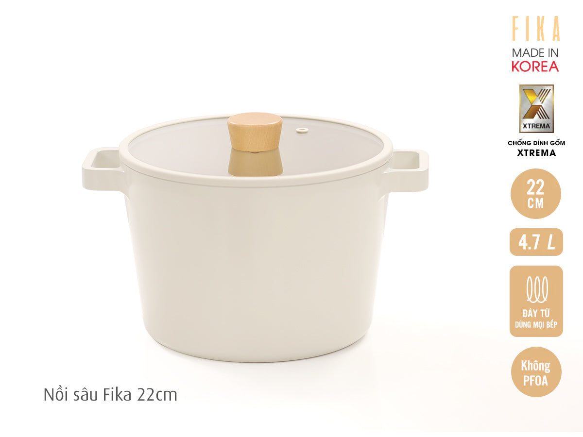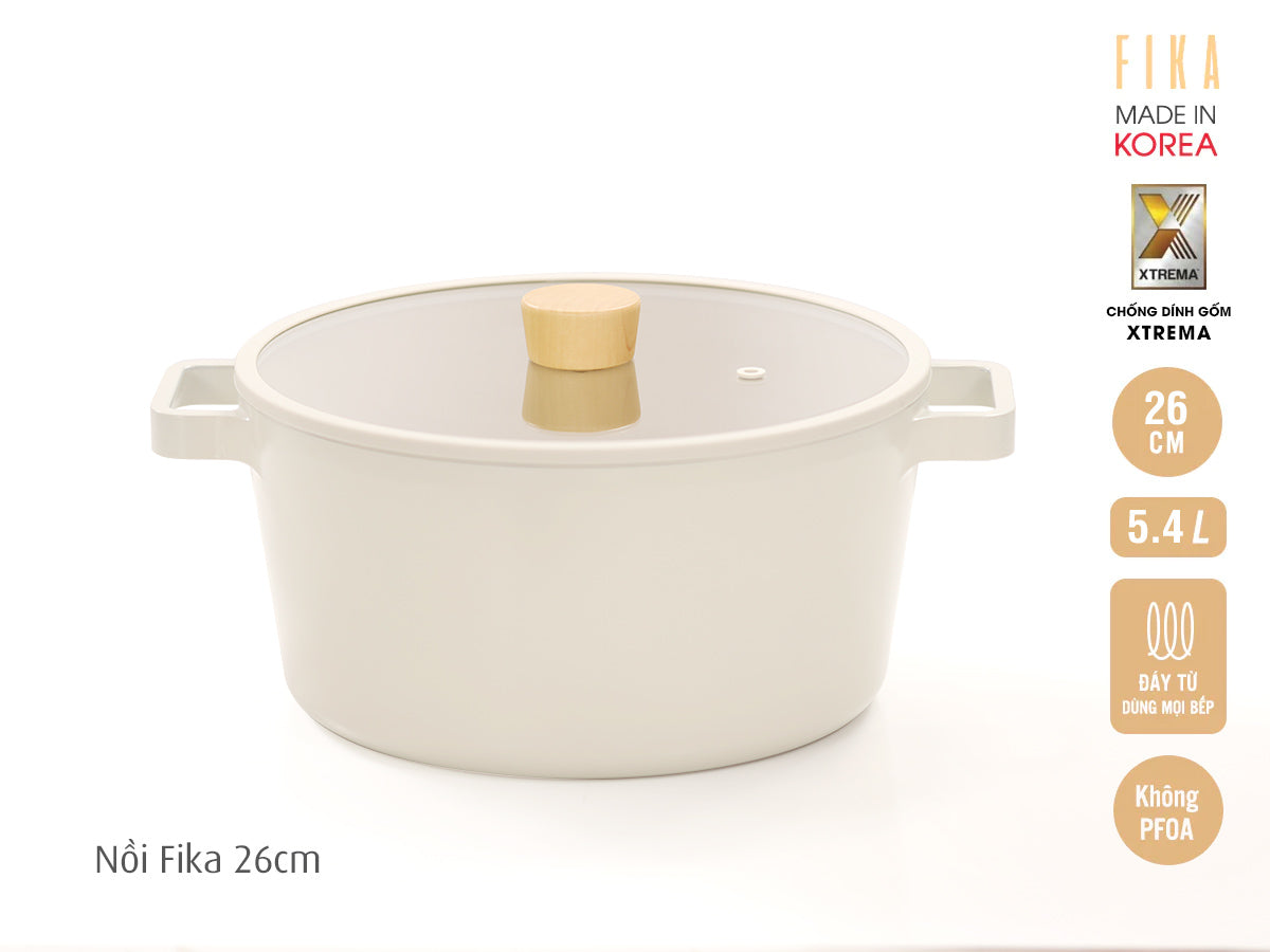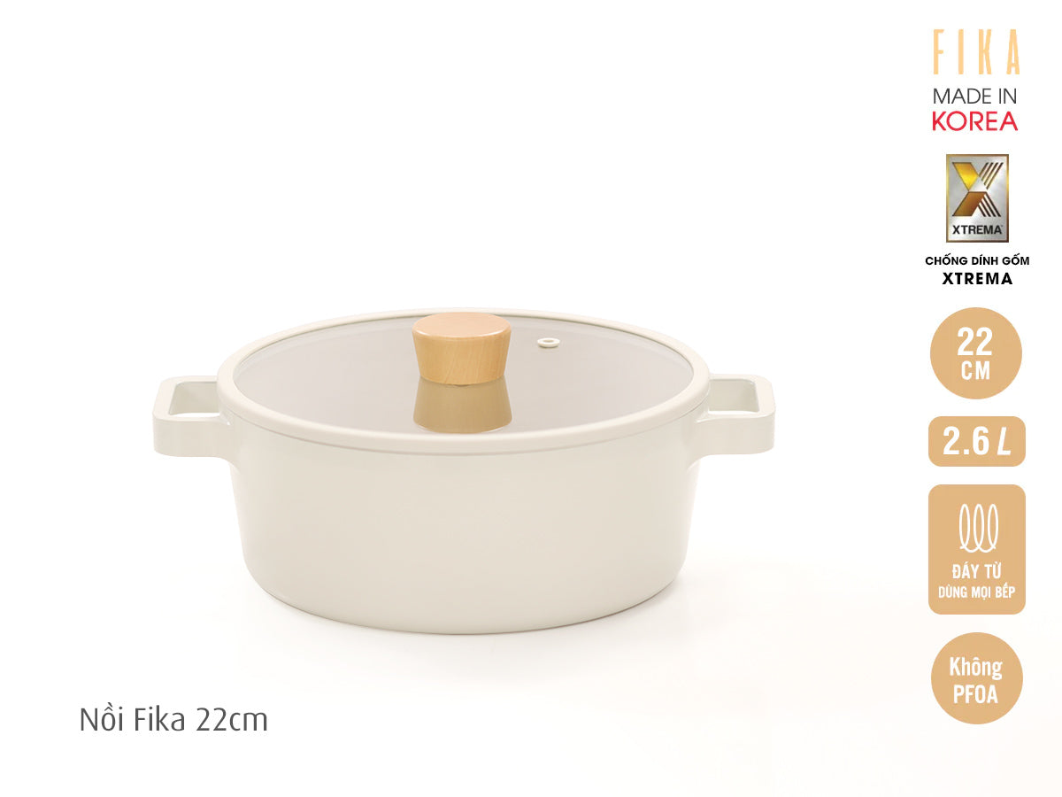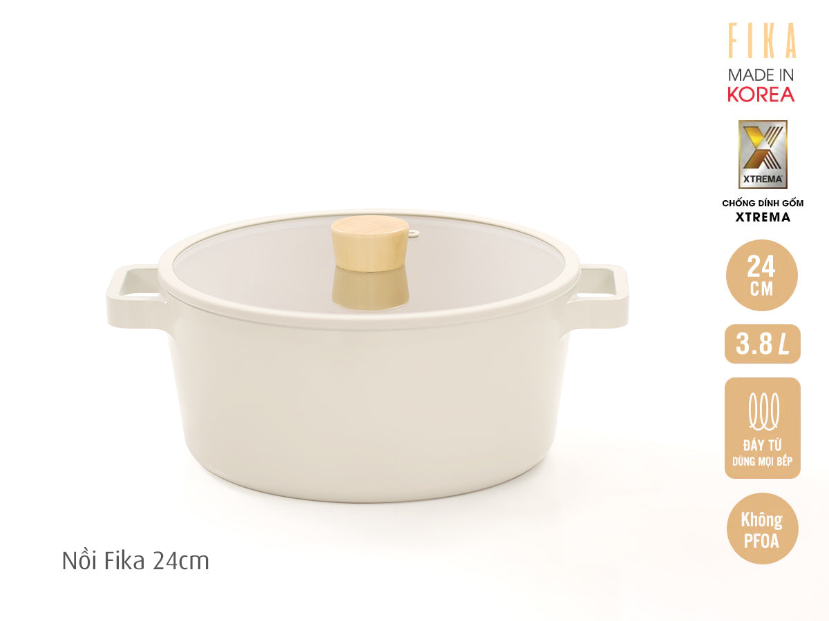 Nồi Fika làm từ hợp kim nhôm đúc nguyên khối, 2 tay cầm đúc liền. Sản phẩm phủ gốm chống dính Xtrema cả hai mặt trong và ngoài. Chất liệu chống dính hoàn toàn từ tự nhiên nên an toàn cho sức khoẻ. Khả năng dẫn và giữ nhiệt cực tốt nên nấu món ăn dễ dàng và ngon hơn.
