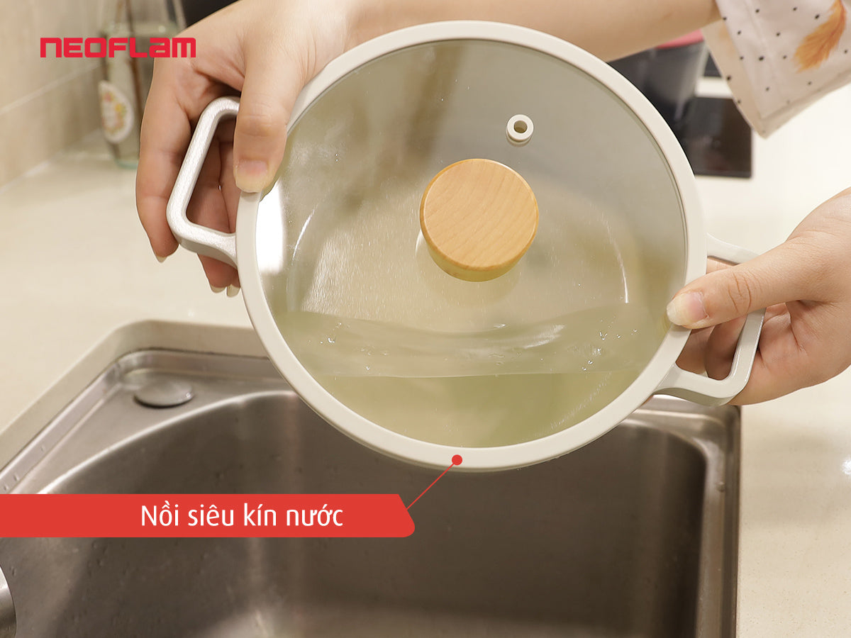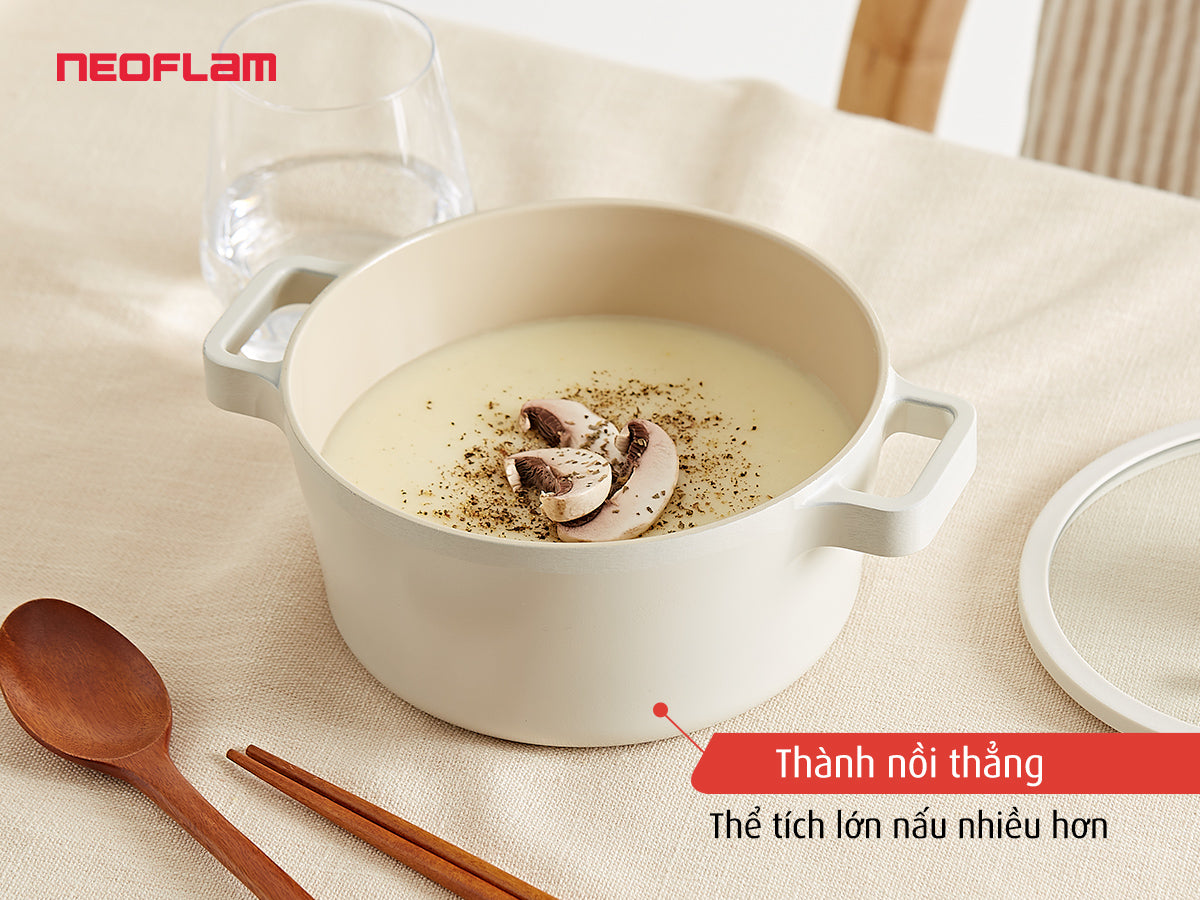 Thân nồi bằng nhôm đúc nguyên khối với 2 tay cầm 2 bên liền khối nên đẹp và chắc chắn hơn. Kĩ thuật đúc đặc biệt từ Neoflam tạo ra chiếc nồi với khả năng hấp thu nhiệt và giữ nhiệt cực tốt, cùng với vung viền Silicone thiết kế gờ gấp vuông góc nên siêu kín, giúp bạn dễ dàng nấu các món âm ỉ nhiệt ngon hơn nhiều!