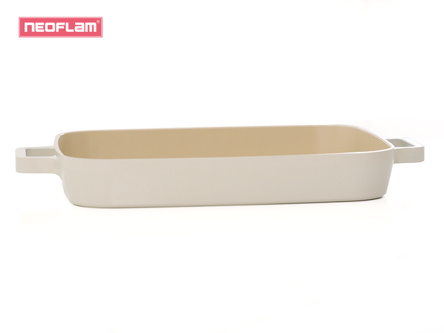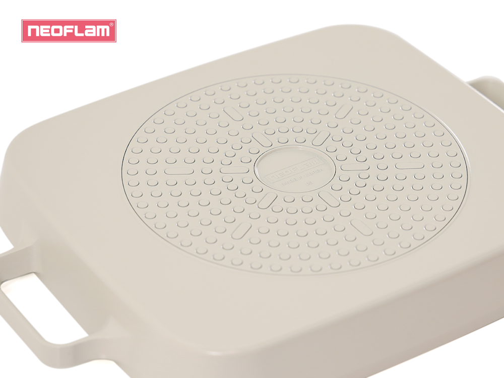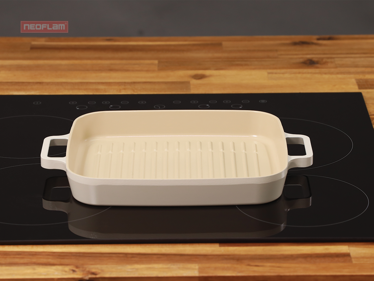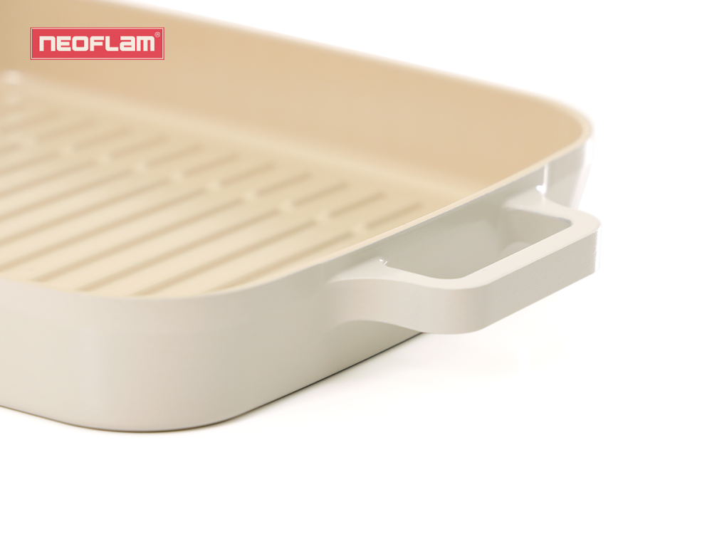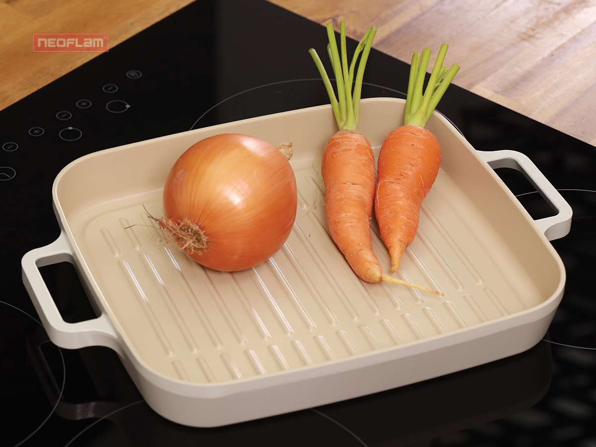Chảo hình chữ nhật, lòng rộng nướng được nhiều thực phẩm cùng lúc. Lòng chảo có gân giúp món nướng bớt mỡ và không cháy.